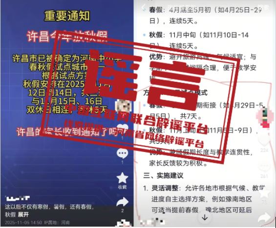 真相:近日,河南、安徽部分自媒體平臺發(fā)布關(guān)于中小學(xué)春秋放假的信息,聲稱“許昌市已被確定為河南中小學(xué)春秋假試點(diǎn)城市之一”“周口市中小學(xué)2025年秋假時間安排如下”“蕪湖市中小學(xué)將在11月12日至14日放首個秋假,連周末共5天”,引發(fā)關(guān)注。對此,河南許昌、周口及安徽蕪湖教育部門作出回應(yīng):并無放秋假的安排,網(wǎng)傳消息均為謠言。中小學(xué)放假安排需嚴(yán)格遵循國家教育方針政策及當(dāng)?shù)亟逃块T的統(tǒng)一部署,結(jié)合本地教育教學(xué)實際統(tǒng)籌規(guī)劃。如需了解相關(guān)安排,請通過屬地教育部門官方網(wǎng)站,切勿輕信、傳播未經(jīng)官方確認(rèn)的“小道消息”。(來源:“清朗河南”微信公眾號、@大河網(wǎng)、安徽網(wǎng)絡(luò)辟謠平臺)