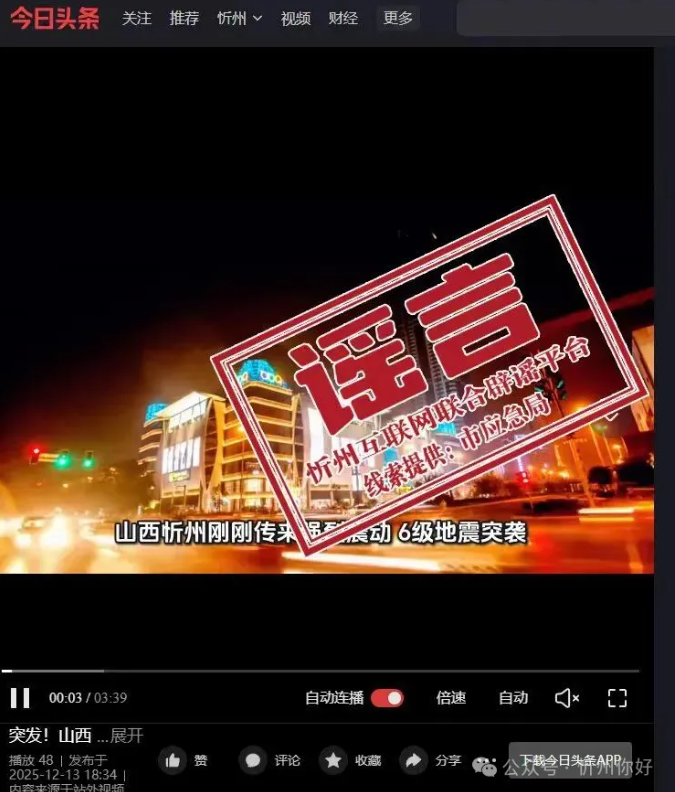 2025年12月13日,有網(wǎng)民發(fā)布“突發(fā)!山西忻州遭遇6級地震,多地震感強烈”等不實信息,引發(fā)網(wǎng)民關(guān)注。