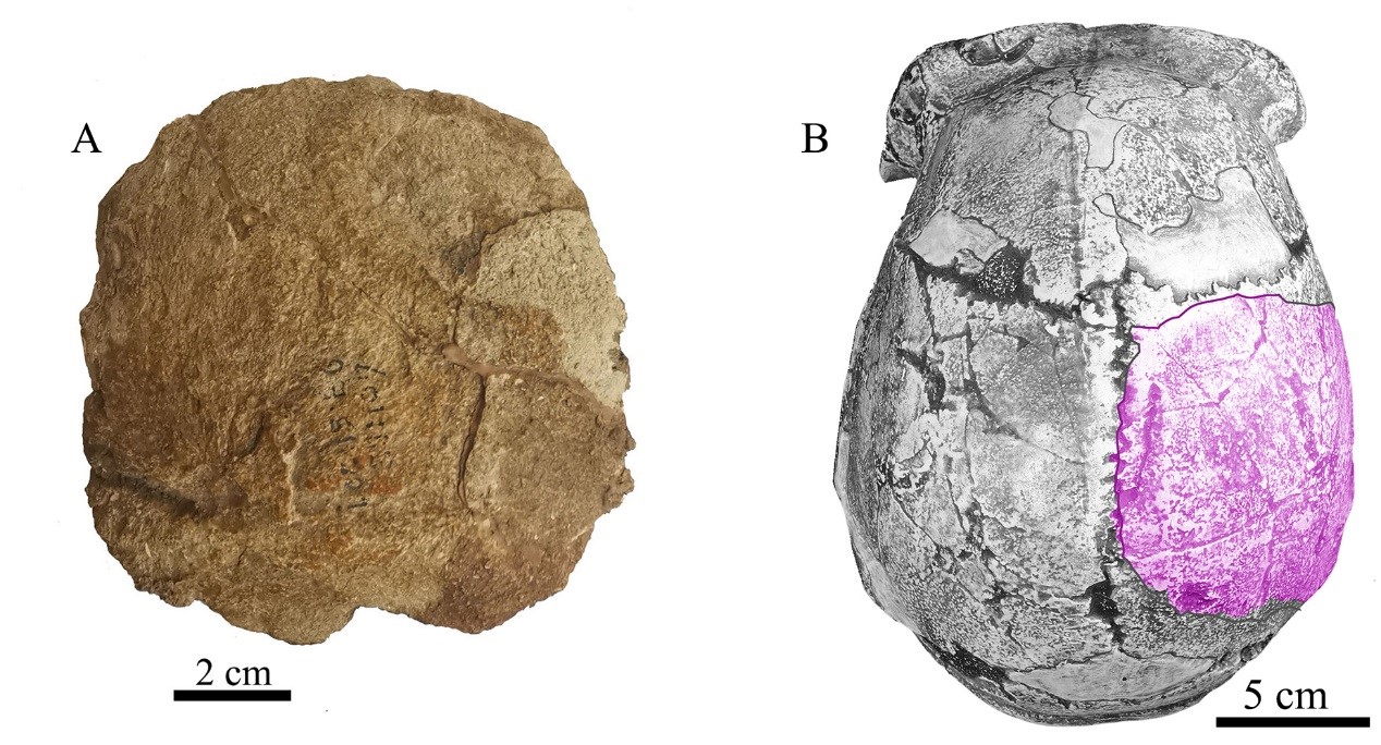 周口店第15號地點發(fā)現(xiàn)的人類頂骨化石。左側(cè):頂骨化石外側(cè)面觀;右側(cè):周口店直立人頭蓋骨模型頂面觀,示頂骨化石位置。中國科學院供圖
