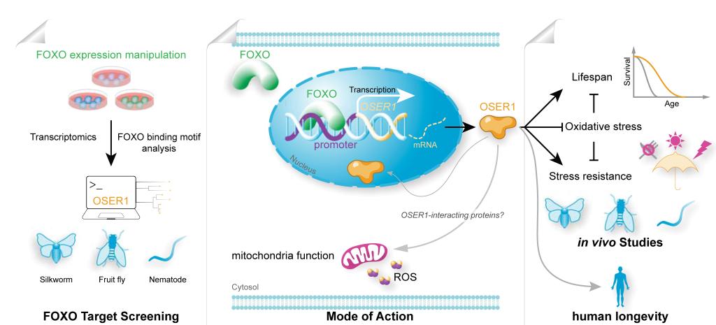 記者從西南大學獲悉,該校資源昆蟲高效養(yǎng)殖與利用全國重點實驗室教授代方銀團隊聯(lián)合國外專家研究發(fā)現(xiàn)調(diào)控壽命的新基因OSER1,并在家蠶、線蟲、果蠅等多物種中研究揭示了其作用機制。作為長壽基因FOXO(叉頭框蛋白O)的靶基因,OSER1對壽命的影響得到人類受試者研究結(jié)果支持。