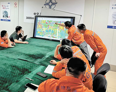 “夢想”號指揮部主要負(fù)責(zé)人周昶(前)在動力控制室查看船上情況。 中國地質(zhì)調(diào)查局宣傳教育中心供圖