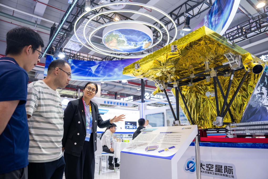 9月24日,第四屆北斗規(guī)模應(yīng)用國(guó)際峰會(huì)在湖南株洲開幕。圖為在株洲國(guó)際會(huì)展中心,工作人員(左三)在介紹一臺(tái)對(duì)地觀測(cè)衛(wèi)星。新華社記者 陳思汗 攝