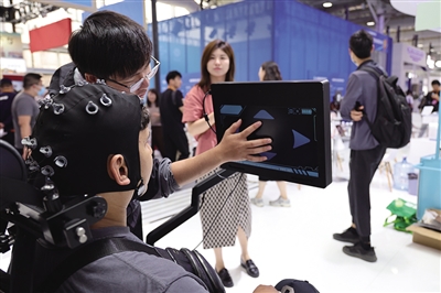 圖為2024服貿(mào)會上,工作人員在為參觀者講解使用非侵入式腦機接口技術(shù)的腦控神經(jīng)康復(fù)訓(xùn)練機器人。記者 戚曉毅 攝