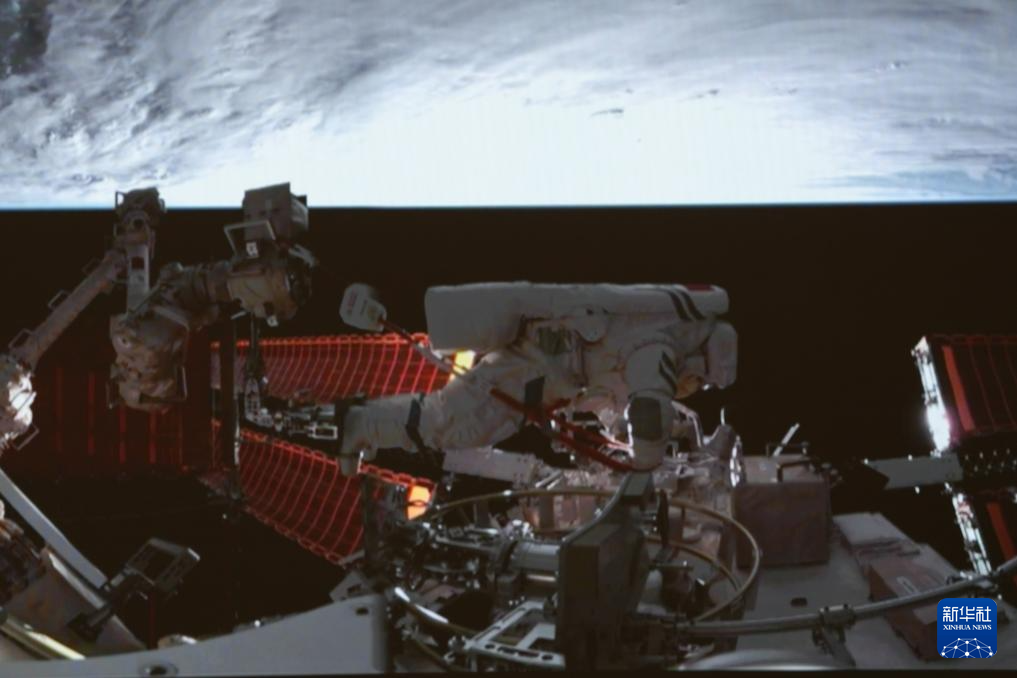 1月20日在北京航天飛行控制中心拍攝的神舟十九號(hào)航天員宋令東在空間站組合體艙外工作的畫面。新華社記者 劉芳 攝