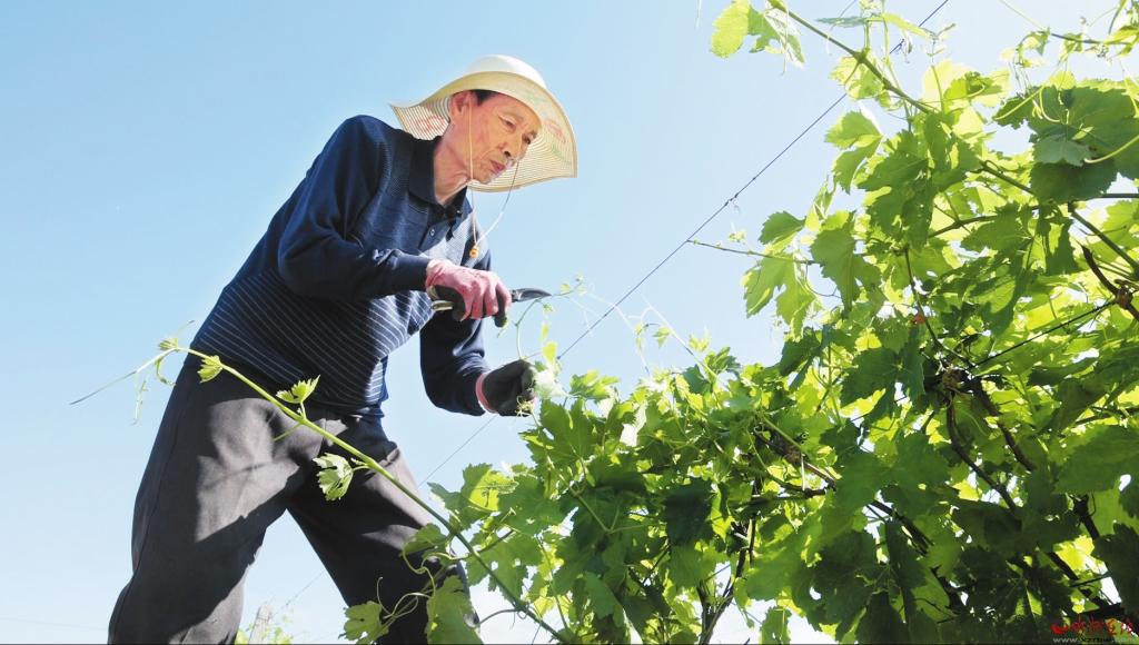 張吉珍在繁峙縣瓦磁地千畝葡萄園修剪葡萄枝