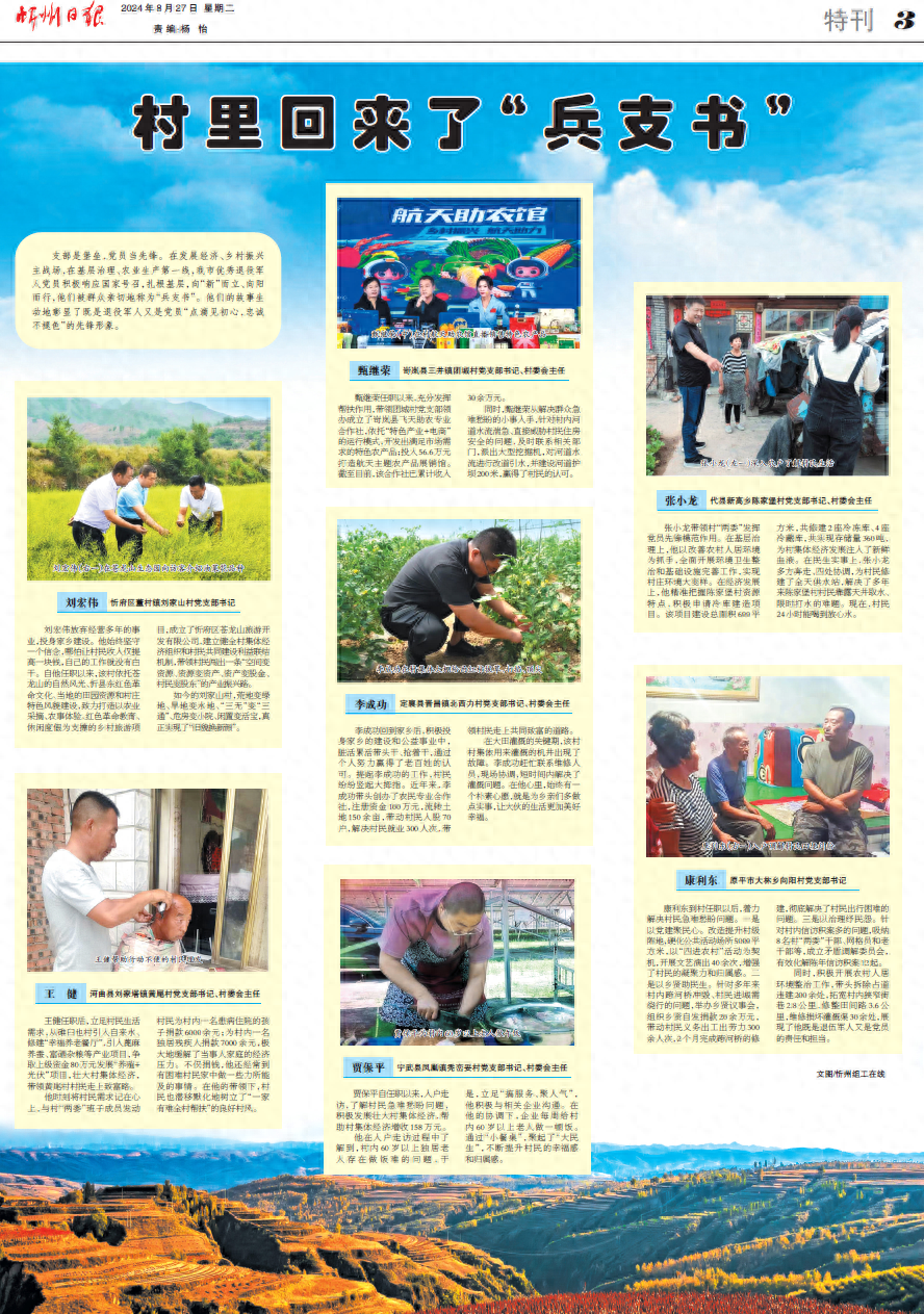支部是堡壘,黨員當(dāng)先鋒。在發(fā)展經(jīng)濟(jì)、鄉(xiāng)村振興主戰(zhàn)場(chǎng),在基層治理、農(nóng)業(yè)生產(chǎn)第一線,我市優(yōu)秀退役軍人黨員積極響應(yīng)國(guó)家號(hào)召,扎根基層,向“新”而立、向陽(yáng)而行,他們被群眾親切地稱(chēng)為“兵支書(shū)”。他們的故事生動(dòng)地彰顯了既是退役軍人又是黨員“點(diǎn)滴見(jiàn)初心,忠誠(chéng)不褪色”的先鋒形象。