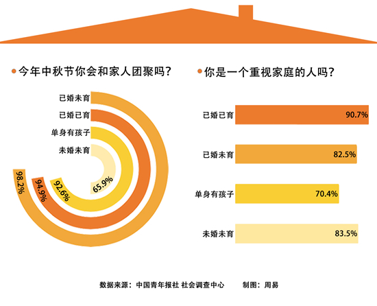中秋節(jié)是家庭團圓的節(jié)日。前段時間居家防疫,很多人和家人在一起的時間變長,感受到了家庭生活的溫暖。今年中秋節(jié)你會和家人團聚嗎? 近日,中國青年報社社會調查中心通過問卷網(wǎng)(wenjuan.com),對1018名受訪者進行的一項調查顯示,今年中秋節(jié),92.9%的受訪者會和家人團聚。82.1%的受訪者把組建屬于自己的小家庭當作人生中必須要做的事,88.2%的受訪者認為自己是一個重視家庭的人。對于當下熱播的家斗劇和離婚劇,46.3%的受訪者認為反映了確實存在的家庭矛盾,43.1%的受訪者認為過度強調矛盾,忽略了愛。 92.9%受訪者中秋節(jié)會和家人團聚 27歲的房佳慧(化名)在北京一家律所工作,老家在河北。為了買到今年十一長假回家的火車票,她專門設了早上的鬧鐘提醒自己搶票。在房佳慧看來,中秋節(jié)是僅次于春節(jié)的重要節(jié)日,應該盡量回家陪陪父母。 鄭奕寬是一名90后,今年剛剛入職杭州的一家設計公司。因為工作太忙,鄭奕寬中秋節(jié)不打算回家。“上半年我一直在老家,陪伴家人的同時也在為找工作發(fā)愁。現(xiàn)在終于找到一份還算不錯的工作,我想利用假期整理一下手頭的事情,盡快適應工作節(jié)奏”。 調查顯示,今年中秋節(jié),92.9%的受訪者會和家人團聚。已婚未育的受訪者這一比例最高(98.2%),未婚未育受訪者這一比例最低(65.9%)。 張晨(化名)在成都一家地產(chǎn)公司工作,家人都在江西老家。張晨坦言,他既希望節(jié)日能回家,也有點擔心?!拔腋改负蛺廴嗽诶霞艺疹櫺『?、料理家務很辛苦,因為聚少離多,我和家人之間缺乏溝通,難免有些矛盾。每次我回家,都要被家人抱怨,我挺理解他們的,就是有點心累”。 對于過節(jié)回家,不少人和張晨有一樣的心態(tài)。前段時間居家防疫,也有不少人一邊感嘆家庭生活的美好,一邊表示自己被各種家庭矛盾困擾。 本次調查顯示,39.8%的受訪者在為一些家庭矛盾煩惱。男性受訪者這一比例(40.9%)略高于女性受訪者(38.8%)。已婚已育受訪者這一比例(42.4%)高于其他人群。 夫妻矛盾(47.7%)和婆媳矛盾(46.7%)是受訪者面臨的主要家庭矛盾,其他還有親子矛盾(38.3%)、兄弟姐妹之間的矛盾(37.0%)等。 張晨坦言,有孩子之后,他面對的家庭矛盾變多了?!皫Ш⒆哟_實很累,尤其是剛開始的那一兩年,我愛人和父母在育兒觀念上也有一些分歧。雖然沒什么大問題,但這些雞毛蒜皮有時會讓家庭氣氛變得很緊張。我在外地,幫不上什么忙,擔心又內(nèi)疚”。 遇到家庭矛盾,41.2%受訪者會努力溝通 受訪者如何應對家庭矛盾?調查顯示,41.2%的受訪者會努力溝通,不回避,29.6%的受訪者會包容退讓,能忍則忍,18.3%的受訪者會采取放著不管的冷處理方式,10.1%的受訪者會作出謾罵指責、發(fā)泄情緒的行為。 “居家過日子,勺子難免碰鍋沿,解決家庭矛盾還是要多溝通?!狈考鸦壅J為,家人之間刻意回避矛盾容易讓彼此埋下心結,“很多家庭矛盾,當事人作出主動溝通的姿態(tài),就已經(jīng)化解大半了”。 張晨則認為,家不是講理的地方,還是要彼此多包容?!爸耙恍┘叶穭√貏e火,還有一些離婚劇也在熱播。這類電視劇里的家庭成員往往針鋒相對、水火不容。我愛人和我媽有時還拿劇情給我舉例子,我覺得她們自我代入太深了”。 調查顯示,對于家斗劇和離婚劇,部分受訪者持肯定態(tài)度,包括:反映了確實存在的家庭矛盾(46.3%),為處理家庭矛盾提供了參考(39.3%),能呼吁家庭成員關注彼此(38.1%)。 部分受訪者持負面看法,包括:過度強調矛盾,忽略了愛(43.1%),劇情離譜,過于夸張(40.4%),導致觀眾過度代入,對家人猜忌疏離(36.2%)等。 男性和女性對這類電視劇的看法略有差異。男性受訪者更多認為這種劇過度強調矛盾,忽略了愛,女性受訪者則更認同反映了確實存在的家庭矛盾。 未婚未育受訪者對這類電視劇更多持正面看法,56.5%的未婚未育受訪者認為反映了確實存在的家庭矛盾,比例高于已婚已育的受訪者。 鄭奕寬告訴記者,雖然他不愛看家斗劇,但經(jīng)常聽到身邊的年輕人討論?!坝械膭】赡艽_實說出了一些人在家庭生活中的處境。我對家庭代際矛盾就挺有感觸的,原生家庭對一個人的影響很大。但是作為觀眾,我更容易被溫馨的東西打動,不太喜歡‘宮斗’一樣的家庭劇劇情”。 82.1%受訪者把組建小家庭當作人生必做的事 作為家里的獨生女,工作4年來,房佳慧每年中秋節(jié)都要回家看望父母。她認為父母重視家庭的觀念深深地影響了自己:“我25歲就結婚了,一方面是因為幸運地遇到了對的人,另一方面是因為我對婚姻和家庭生活比較期待,我父母就過得挺幸福的”。 調查顯示,82.1%的受訪者把組建屬于自己的小家庭當作人生中必須要做的事,13.9%的受訪者表示說不好,僅4.0%的受訪者回答不是。 88.2%的受訪者認為自己是一個重視家庭的人,7.9%的受訪者表示說不好,3.9%的受訪者回答不是。進一步分析發(fā)現(xiàn),90.7%的已婚已育受訪者確認自己重視家庭,比例高于其他受訪者。 雖然時常被家庭瑣事煩惱,但張晨始終把家庭當作溫暖的港灣和堅強的后盾?!叭绻麤]有家人的付出,我就不能在外地好好工作。給家人更好的生活是我工作的動力”。 鄭奕寬坦言,家斗劇和“天價彩禮”“閃婚閃離”等現(xiàn)象會打擊他對婚姻和家庭的信心,“有時面對父母催婚,我會覺得現(xiàn)在的單身狀態(tài)比較自在,但我心里其實很