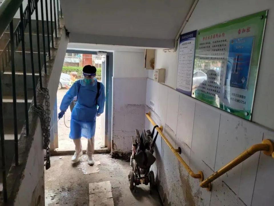 “益行志愿服務(wù)隊從8月4日17點(diǎn)下班后開始組織救災(zāi)工作,到凌晨24點(diǎn)充分準(zhǔn)備完畢??傆嫵鰟?輛汽車,志愿者們對社區(qū)內(nèi)的一樓單元門口、垃圾分類驛站、居民家里、黨群活動中心、居委會物資庫、社區(qū)花園內(nèi)和道路,開展清理淤泥和清洗路面工作?!睆垈惤榻B道。