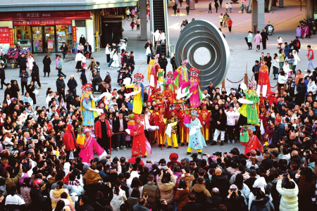 2月11日,孝義市時代天街人潮涌動,紅火熱鬧的背鐵棍等傳統民間表演吸引人們駐足觀看。