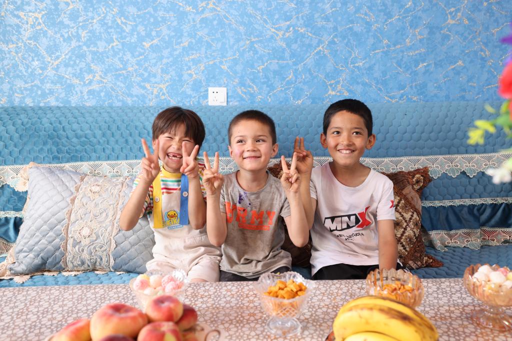 6月30日,在烏什縣亞曼蘇柯?tīng)柨俗巫遴l(xiāng)幸福新區(qū),小朋友們?cè)谛录彝嫠?。新華社發(fā)(楊碩 攝)