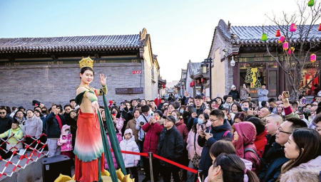 “在大同古城鬧紅火,真是年味兒十足、體驗感拉滿。”來自太原的游客張文文開心地說。春節(jié)假期,大同市文化活動豐富多彩,以大同古城為中心,市縣(區(qū))聯(lián)動開展的“流光溢彩迎新年”“歡歌樂舞過大年”“梨園百花賀新年”“夢幻冰雪逐夢年”“翰墨書香文化年”“古都風華盛世年”6個主題43項地方特色濃郁、群眾參與度高的文化活動,讓市民和游客目不暇接、流連忘返。在華嚴廣場、鼓樓東西街、下寺坡街、關帝廟戲臺、純陽宮廣場、大廟角、古城東南邑等處,社火巡游、過大年唱大戲、文化IP演繹、市集等活動精彩紛呈。