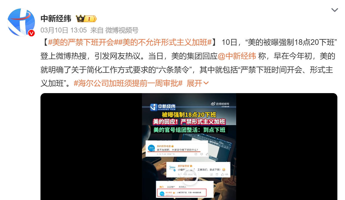 美的回應(yīng)媒體時(shí)表示,今年以來(lái),美的明確了關(guān)于簡(jiǎn)化工作方式要求的“六條禁令”,其中就包括“嚴(yán)禁下班時(shí)間開會(huì)、形式主義加班”。