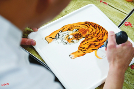 1.在阿峰的操作下,一只栩栩如生的老虎“躍然”盤(pán)上。