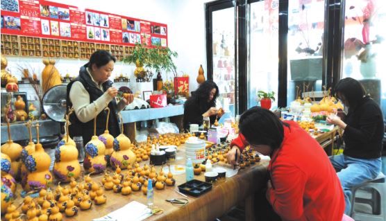 在工作室內(nèi),手工藝人侯晉麗正專注地為葫蘆彩繪。她介紹說:“我們制作的每一件葫蘆雕刻作品都需要多重工序,從篩選葫蘆到刮皮、晾曬、浸泡、拋光,再到依形構(gòu)思、打稿設計,最后經(jīng)過線刻、浮雕等精雕細琢與上色收尾,每一個工序都考驗著我們的耐心與功力。”