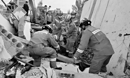 由于路途遙遠(yuǎn),3時(shí)30分,先期救援力量2車8人到達(dá)事故現(xiàn)場。經(jīng)現(xiàn)場偵查和詢問知情人得知:坍塌房屋為一棟磚木結(jié)構(gòu),房頂為預(yù)制板,房屋坍塌現(xiàn)場一片狼藉,面積約50平方米的空間內(nèi),土塊、瓦礫、預(yù)制板、家具雜亂無章。3人被埋在廢墟下,且房屋的墻體發(fā)生大角度傾斜并伴有多處裂縫,隨時(shí)都有再次倒塌的危險(xiǎn)。由于現(xiàn)場作業(yè)面有限,不能使用機(jī)械設(shè)備,廢墟下面還有被埋人員,救援動作不能太大,給消防救援帶來很大困難。
