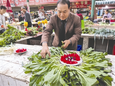 “那時孩子在成都理工大學上學,家里經(jīng)濟壓力很大。”6年前,王美成接替妻子開始在城區(qū)賣菜,他發(fā)現(xiàn)有時菜并不好賣?!坝幸淮挝胰ゾ频陞⒓友鐣?,看到酒店里有的菜品裝飾挺好看,我就想是不是也可以把花裝飾在菜攤上。嘗試之后發(fā)現(xiàn)效果挺好,大家都喜歡。”