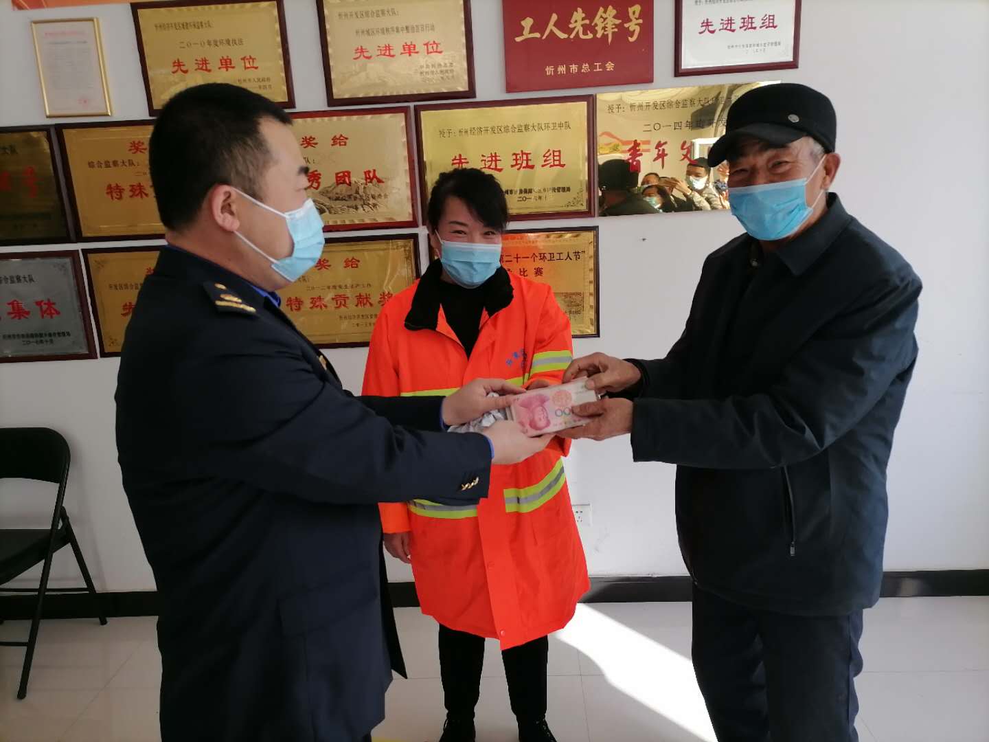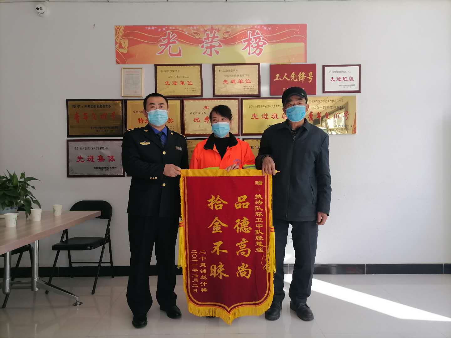 2月5日上午,來(lái)到忻州開(kāi)發(fā)區(qū)城管綜合執(zhí)法隊(duì)辦公室。連日來(lái),因丟失2萬(wàn)元現(xiàn)金籠罩在69歲農(nóng)民工趙大爺和他一家人心頭的煩惱和惆悵一掃而光。 “真是遇到了好心人,我們一家人這下可以安心過(guò)個(gè)年了!……”當(dāng)泛華小區(qū)門(mén)衛(wèi)趙大爺親手接過(guò)失而復(fù)得的巨額現(xiàn)金時(shí),抑制不住內(nèi)心的激動(dòng),緊緊握著環(huán)衛(wèi)女工張慧蓮的手不停地道謝,并送上全家人的心愿“拾金不昧 品德高尚”錦旗。 事情要從2月2日上午說(shuō)起,環(huán)衛(wèi)工張慧蓮像往常一樣在責(zé)任路段進(jìn)行衛(wèi)生清掃。當(dāng)她清掃到開(kāi)發(fā)區(qū)郵政局門(mén)前的非機(jī)動(dòng)車(chē)道附近時(shí),突然發(fā)現(xiàn)一個(gè)不起眼的黑色塑料袋。打開(kāi)一看,里邊裝著兩捆百元大鈔。心想丟錢(qián)的人一定非常著急……而當(dāng)時(shí)天寒地凍四下無(wú)人,于是,張慧蓮一邊看護(hù)好“塑料袋”,一邊在原地等候。一直到中午時(shí)分仍不見(jiàn)有人來(lái)尋找。于是,她決定在下班前把“塑料袋”交回執(zhí)法隊(duì)領(lǐng)導(dǎo)手中,經(jīng)領(lǐng)導(dǎo)和同志們現(xiàn)場(chǎng)清點(diǎn),一共是2萬(wàn)元人民幣現(xiàn)金。 為了盡快找到失主,忻州開(kāi)發(fā)區(qū)城管綜合執(zhí)法隊(duì)負(fù)責(zé)人第一時(shí)間聯(lián)系市主流媒體忻州日?qǐng)?bào)社并通過(guò)忻州在線網(wǎng)發(fā)布了《環(huán)衛(wèi)工撿到兩萬(wàn)元急尋失主》的消息。之后,幾經(jīng)輾轉(zhuǎn),失主趙大爺?shù)挠H友看到這一重要信息,及時(shí)轉(zhuǎn)告了趙大爺及其家屬。因丟失現(xiàn)金急得團(tuán)團(tuán)轉(zhuǎn)的一家人,立即與開(kāi)發(fā)區(qū)城管執(zhí)法隊(duì)領(lǐng)導(dǎo)取得了聯(lián)系,并約定了相關(guān)認(rèn)領(lǐng)、交接時(shí)間和辦法。 “不是自己的錢(qián)堅(jiān)決不能拿,我十分理解丟失巨額現(xiàn)金人急切的心情。雖然我是一個(gè)普通的環(huán)衛(wèi)工人,也許生活并不富足,但認(rèn)真做事,踏實(shí)做人是我的人生準(zhǔn)則。生活在這個(gè)越來(lái)越美好的城市,我愿做一朵文明建設(shè)的“浪花”……”在交還失“金”現(xiàn)場(chǎng),張慧蓮靦腆地對(duì)記者說(shuō)。 開(kāi)發(fā)區(qū)城管綜合執(zhí)法隊(duì)副隊(duì)長(zhǎng)姜宇星向見(jiàn)證這一義舉的媒體記者介紹說(shuō),張慧蓮和丈夫石成良的經(jīng)濟(jì)條件并不寬裕,兩個(gè)人的月工資都在2000元上下。說(shuō)實(shí)話,2萬(wàn)元對(duì)其家庭來(lái)說(shuō)也是個(gè)巨大的數(shù)字了。拾金不昧,我們的環(huán)衛(wèi)女工張慧蓮做到了。其實(shí),好人就在我們的身邊。張慧蓮用自己拾金不昧的行動(dòng)彰顯了一座城市的文明刻度,是我們這支認(rèn)真負(fù)責(zé),兢兢業(yè)業(yè),文明向上隊(duì)伍的一個(gè)形象縮影和代言人。 “在‘近者悅,遠(yuǎn)者來(lái)’的文明忻州,如果你做一點(diǎn),我做一點(diǎn),把好事善事匯聚成這個(gè)城市的一種品格,相信我們的生活就會(huì)越來(lái)越美好?!睆埢凵徝摽诙?。 環(huán)衛(wèi)工人是美麗城市、文明城市建設(shè)不可或缺的一支重要力量。據(jù)了解,近年來(lái),該隊(duì)環(huán)衛(wèi)工人撿拾現(xiàn)金、證件、手機(jī)等物品等好人好事已有100余起,每次都讓失物及時(shí)完壁歸趙、物歸原主。有熱心市民表示,忻州環(huán)衛(wèi)工是平凡的,也是偉大的,守護(hù)著這座城市的整潔與美麗。 (記者張志遠(yuǎn)) (責(zé)任編輯:梁艷) |