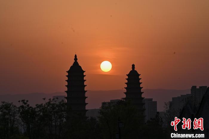 4月17日,山西省太原市,夕陽(yáng)與百年古剎永祚寺雙塔相互映襯,現(xiàn)“雙塔落日”景觀。 中新社記者 韋亮 攝