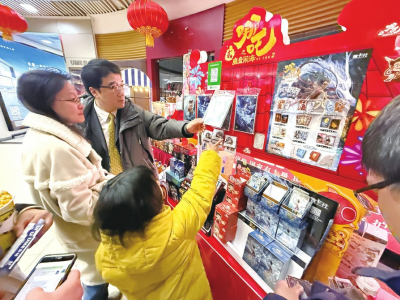 2月14日晚,在北京市海淀區(qū)的UME國際影城(華星店),家長帶著孩子挑選電影紀念品。