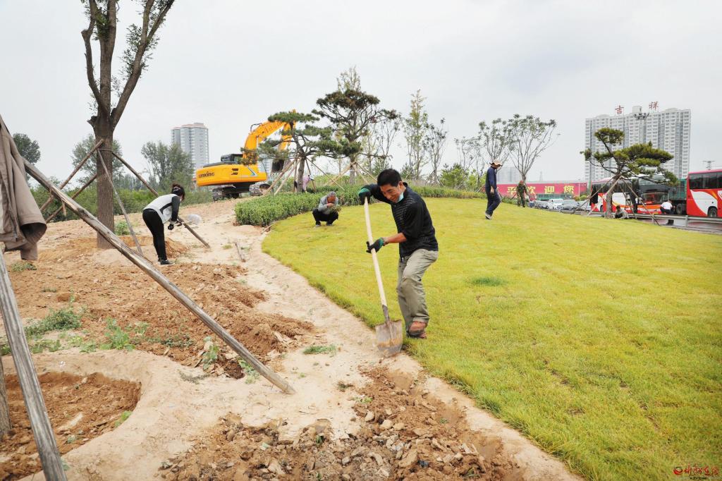 9月14日,原平市高速路口兩側的綠化工作正在如火如荼地進行著。挖掘機揮舞著鐵臂挖掘土壤,數十名工人忙碌著搬運花草,栽植樹木。據了解,該市今年綠化工程總投資1.3億元,對范亭廣場、原平經濟技術開發(fā)區(qū)、高速路口兩側及新華廣場、崞紅線進行綠化提升改造,喬、灌、花、草合理組配,達到增層、增色、增花的效果。(褚 震 攝)