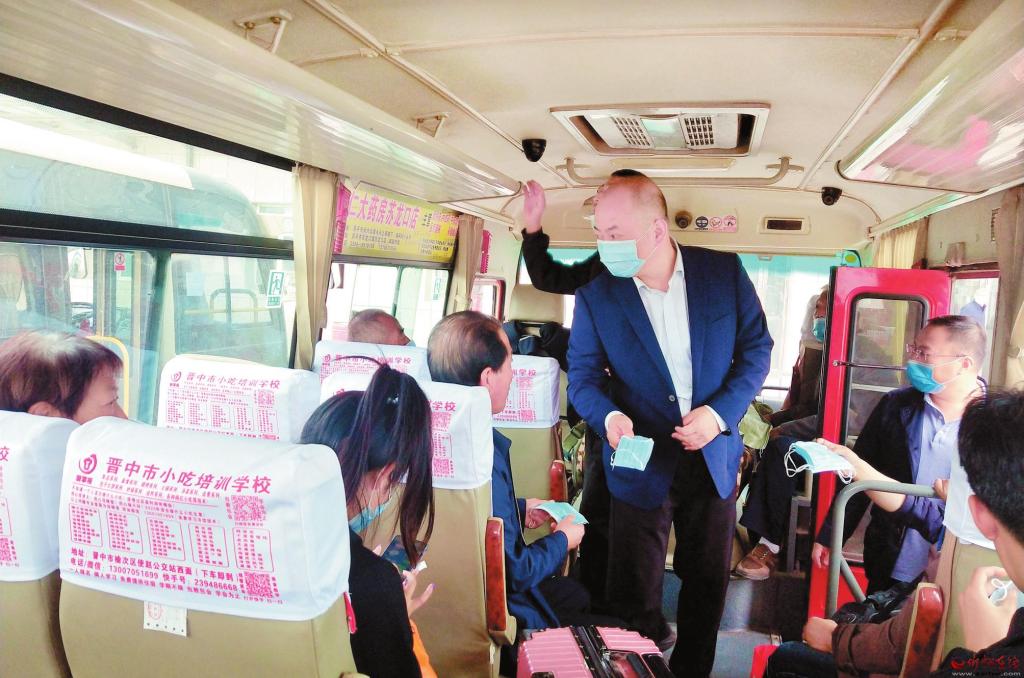 原平市交通運(yùn)輸局加強(qiáng)對(duì)交通運(yùn)輸企業(yè)、“兩客一危一貨”、旅游包車(chē)、網(wǎng)絡(luò)包車(chē)和重點(diǎn)路段的監(jiān)督檢查,嚴(yán)厲打擊“三超一疲勞”、非法載客、超員超限、疲勞駕駛和違規(guī)冒險(xiǎn)行車(chē)等違法違規(guī)行為。在抓安全的同時(shí),將疫情防控常態(tài)化,強(qiáng)調(diào)汽車(chē)站工作人員必須做好登記工作,督促乘客佩戴口罩。圖為工作人員在客車(chē)上為旅客發(fā)放口罩。( 劉建春 攝)