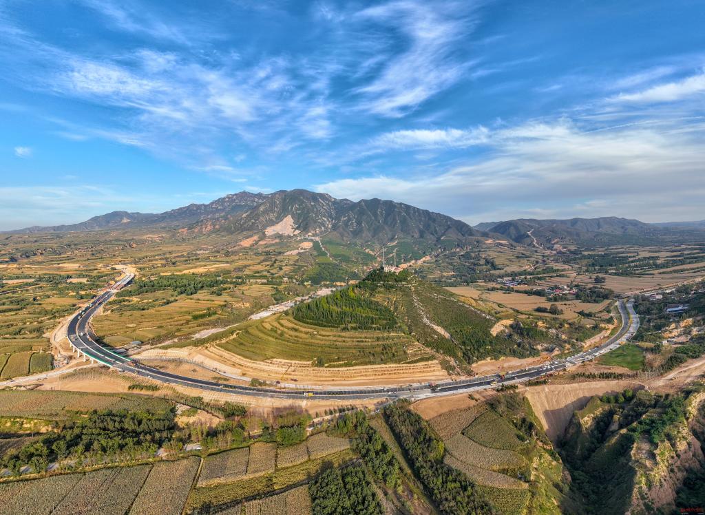 無(wú)人機(jī)升空,視野逐漸開(kāi)闊,太忻大道如同巨龍穿行在大地之上,雄赳赳奔向遠(yuǎn)方。
