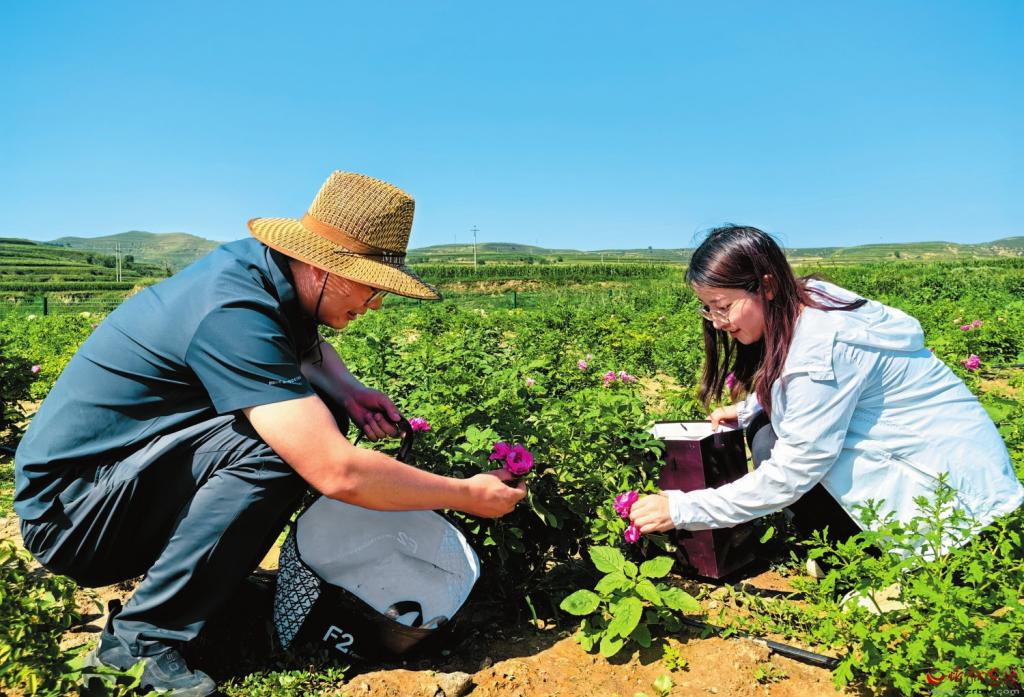在食用玫瑰花收獲的季節(jié),神池縣八角鎮(zhèn)八角村的到村工作大學(xué)生幫助農(nóng)戶進(jìn)行采摘。 吳 杰攝