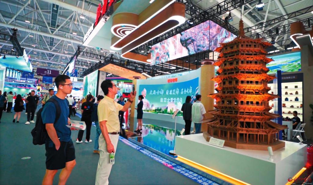 山西晟龍木雕模型藝術(shù)有限公司制作的應(yīng)縣木塔模型一亮相,便吸引了眾多觀展游客的目光。精美絕倫的造型引得人們嘖嘖稱奇,紛紛拿出手機(jī)拍照記錄分享。該模型高約3米,最大直徑1.9米,通過20∶1的比例微縮打造,復(fù)刻了應(yīng)縣木塔的榫卯結(jié)構(gòu),其內(nèi)部樓梯扶手清晰可見,門窗都能打開?!拔覀兊倪@件展品,是由二十多個師傅經(jīng)過半年多的時間完成的。這次為了來深圳參展,我們專門把它從定襄裝運發(fā)車,用了整整兩天半的時間才送到,跨越了將近兩千公里?!痹摴究偨?jīng)理張艷峰告訴記者。