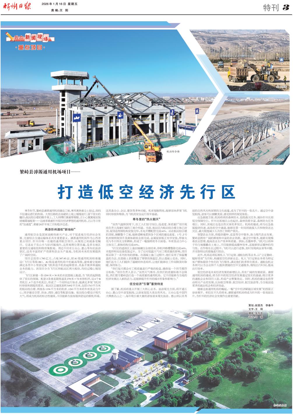 寒冬時節(jié),繁峙縣滹源通用機場建設工地,寒風裹挾著塵土掠過,卻擋不住建設者們的熱情。大型壓路機在凍硬的土地上緩緩前行,留下堅實的轍印;航站綜合樓的腳手架上,工人師傅們裹著厚棉服,正小心翼翼地安裝玻璃幕墻框架——這座承載著忻州低空經(jīng)濟夢想的通用機場,正以冬日里的“加速度”,朝著2027年竣工目標穩(wěn)步邁進。