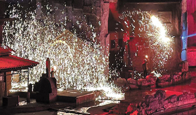 大年初七,晚上7點(diǎn),山西省晉城市司徒小鎮(zhèn)的山水實(shí)景劇《千年鐵魂》準(zhǔn)時(shí)開演。當(dāng)臺(tái)上的幾位工匠將金黃色的鐵水一齊拋灑向天空,絢爛的鐵花在空中綻放,氣勢磅礴。觀眾的情緒也在此刻到達(dá)頂峰。