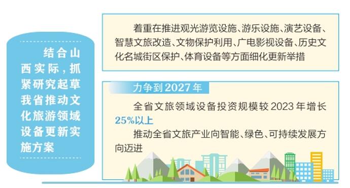 系統(tǒng)推進,夯實重點任務(wù)。結(jié)合山西實際,抓緊研究起草我省推動文化旅游領(lǐng)域設(shè)備更新實施方案,著重在推進觀光游覽設(shè)施、游樂設(shè)施、演藝設(shè)備、智慧文旅改造、文物保護利用、廣電影視設(shè)備、歷史文化名城街區(qū)保護、體育設(shè)備等方面細化更新舉措,明確更新提升重點,力爭到2027年,全省文旅領(lǐng)域設(shè)備投資規(guī)模較2023年增長25%以上,推動全省文旅產(chǎn)業(yè)向智能、綠色、可持續(xù)發(fā)展方向邁進。