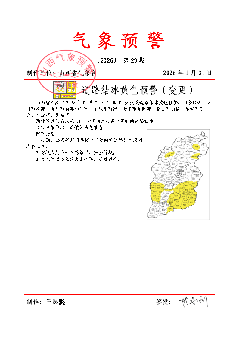 山西省氣象臺(tái)2026年01月31日10時(shí)00分變更道路結(jié)冰黃色預(yù)警,預(yù)警區(qū)域:大同市局部、忻州市西部和東部、呂梁市南部、晉中市東南部、臨汾市山區(qū)、運(yùn)城市東部、長治市、晉城市。預(yù)計(jì)預(yù)警區(qū)域未來24小時(shí)仍有對(duì)交通有影響的道路結(jié)冰。請有關(guān)單位和人員做好防范準(zhǔn)備。防御指南:1.交通、公安等部門要按照職責(zé)做好道路結(jié)冰應(yīng)對(duì)準(zhǔn)備工作;2.駕駛?cè)藛T應(yīng)當(dāng)注意路況,安全行駛;3.行人外出盡量少騎自行車,注意防滑。