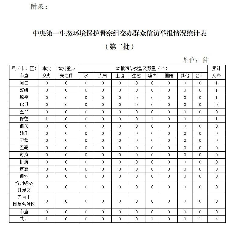 2025年5月30日,中央第一生態(tài)環(huán)境保護(hù)督察組向我市交辦的第二批信訪舉報(bào)件,共1件,其中重點(diǎn)件0件。 按區(qū)域和部門劃分,保德縣1件。本批轉(zhuǎn)辦的信訪件,涉及生態(tài)環(huán)境問題1個(gè),其中,噪聲問題1個(gè)。 當(dāng)日,上述信訪舉報(bào)件均已轉(zhuǎn)交相關(guān)縣。 截至5月30日,中央第一生態(tài)環(huán)境保護(hù)督察組累計(jì)向我市交辦信訪件4件,其中重點(diǎn)關(guān)注件0件。交辦的信訪件中,涉及原平市1件、河曲縣1件、繁峙縣1件、保德縣1件;涉及生態(tài)環(huán)境問題4個(gè),其中水污染問題1個(gè)、大氣污染問題1個(gè)、生態(tài)破壞問題1個(gè)、噪聲污染問題1個(gè)。 注:具體情況見附表
