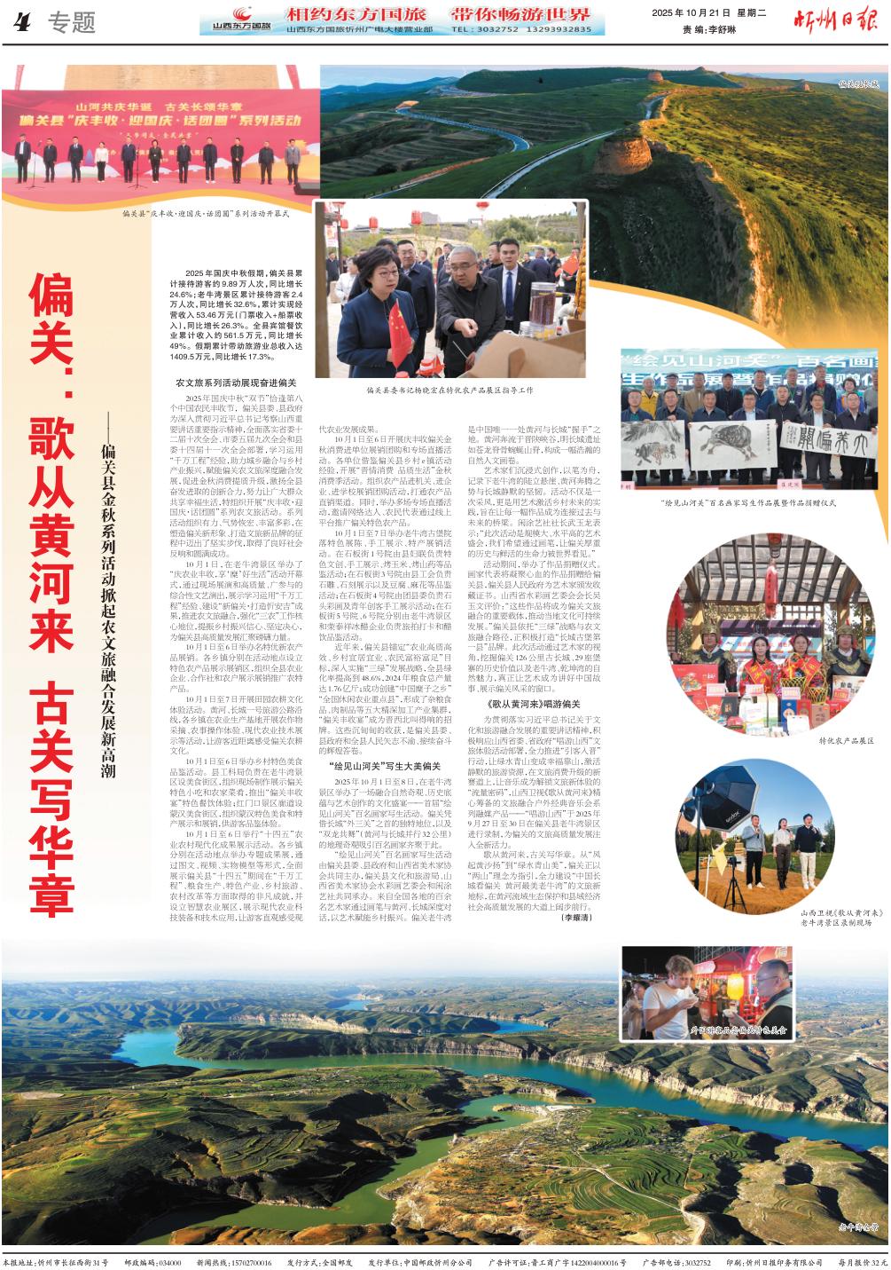 2025年國慶中秋“雙節(jié)”恰逢第八個中國農(nóng)民豐收節(jié),偏關(guān)縣委、縣政府為深入貫徹習(xí)近平總書記考察山西重要講話重要指示精神,全面落實省委十二屆十次全會、市委五屆九次全會和縣委十四屆十一次全會部署,學(xué)習(xí)運用“千萬工程”經(jīng)驗,助力城鄉(xiāng)融合與鄉(xiāng)村產(chǎn)業(yè)振興,賦能偏關(guān)農(nóng)文旅深度融合發(fā)展,促進金秋消費提質(zhì)升級,激揚全縣奮發(fā)進取的創(chuàng)新合力,努力讓廣大群眾共享幸福生活,特組織開展“慶豐收·迎國慶·話團圓”系列農(nóng)文旅活動。系列活動組織有力、氣勢恢宏、豐富多彩,在塑造偏關(guān)新形象、打造文旅新品牌的征程中邁出了堅實步伐,取得了良好社會反響和圓滿成功。