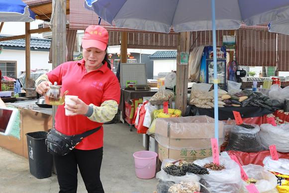 “天太熱,來喝口我這免費(fèi)的茶?!辈湃脒B樟村村口,記者便被熱情的村民陸秀媚招呼到了自己的攤位。紅茶、本地枝葉、山柑皮、筍干……她的攤位琳瑯滿目,擺得滿滿當(dāng)當(dāng)。陸秀媚告訴記者,自己曾經(jīng)在市里賣童裝,剛開始還能掙到些錢,后來隨著網(wǎng)購興起,實體店的生意越來越難做。2018年,在習(xí)近平總書記來連樟村視察后,看到家鄉(xiāng)越變越好,陸秀媚選擇了回到村里創(chuàng)業(yè)。