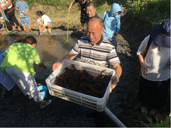 在郴州市吳山村小龍蝦養(yǎng)殖基地,一群游客圍在一個養(yǎng)蝦池邊歡笑不斷,不時響起一聲聲驚喜的尖叫,這里正在進(jìn)行一場“釣蝦大賽”。