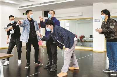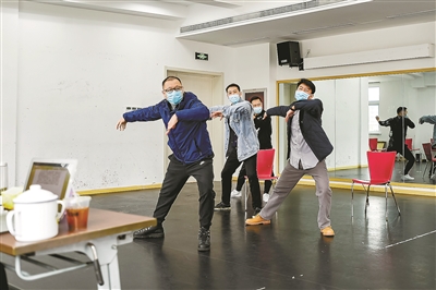 雖然疫情正在向好,但防控的弦還不能就此放松下來。整個藝苑大樓彌漫著消毒水的味道,演員們都戴著口罩,分散在排練廳、會議室、演員隊等各個角落進行排練。