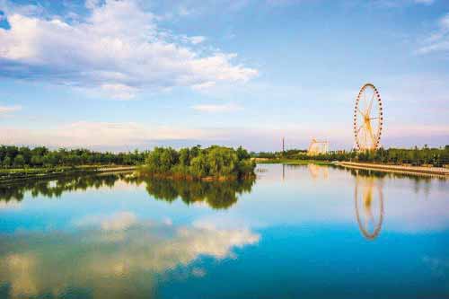 沿著河岸邊的石板路緩緩向西前行,手中撫過岸邊的花崗石欄桿,偶有微風拂面,帶起耳畔凌亂的發(fā)絲,讓人頓覺神清氣爽,想要沉醉在眼前的迷人風光中。這時,不遠處忽然傳來人們的歡呼聲和尖叫聲,我上前一看,原來已經走到了云中河游樂園。游樂園里的娛樂項目多樣,其中最醒目的便是那高達88米、修建時高度居山西第一的摩天輪,伴隨著悅耳的歌謠,摩天輪緩緩地轉動著,帶著人們對浪漫的遐想。