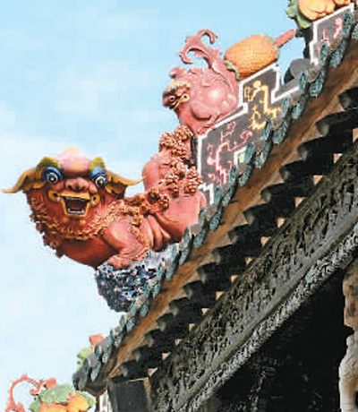 “三雕兩塑”(石雕、木雕、磚雕、陶塑、灰塑)是嶺南傳統(tǒng)建筑常用構(gòu)件。陳家祠建筑屋頂上裝飾著層疊錯(cuò)落、精致繁復(fù)的陶塑和灰塑,堪稱(chēng)一大亮點(diǎn)。曾翔介紹,最頂層的陶塑瓦脊就是著名的“石灣陶”,在廣東佛山石灣鎮(zhèn)燒制而成,內(nèi)容一般以粵劇故事、花卉和吉祥圖案為主。瓦脊下方的基座是灰塑?;宜艿闹谱鞴に嚤容^特別,用石灰摻入糖膠、稻草、糯米等混合發(fā)酵后,往房頂?shù)你~鐵骨架上填抹塑形,再涂上顏色。灰塑沒(méi)有經(jīng)過(guò)高溫?zé)?,容易受風(fēng)雨侵蝕而剝落掉色,每隔五六年就要進(jìn)行保養(yǎng)修復(fù)。