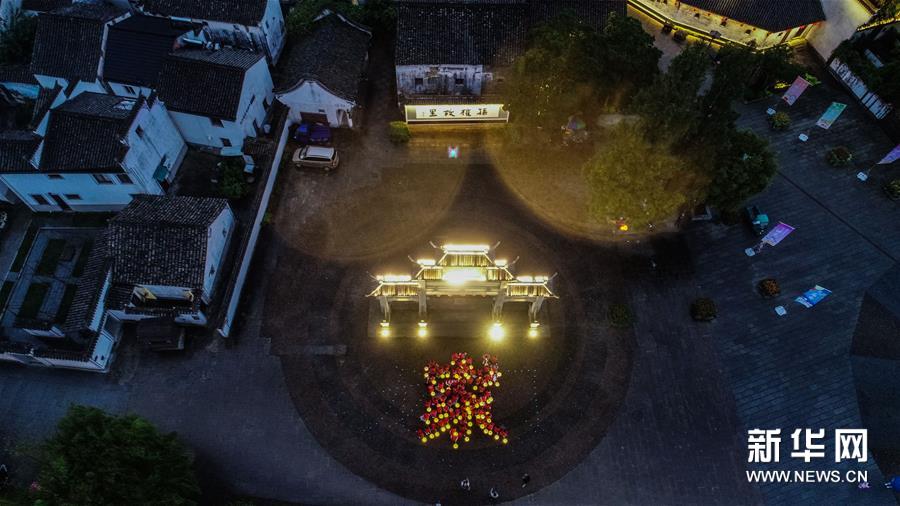 9月29日,龍門鎮(zhèn)文明志愿幫幫團(tuán)的志愿者提著花燈排成一個(gè)“家”字,慶祝古鎮(zhèn)廟會(huì)開啟(無人機(jī)照片)。新華社記者 徐昱 攝