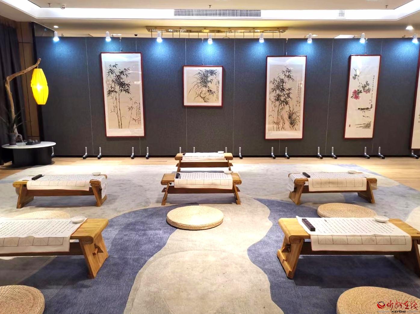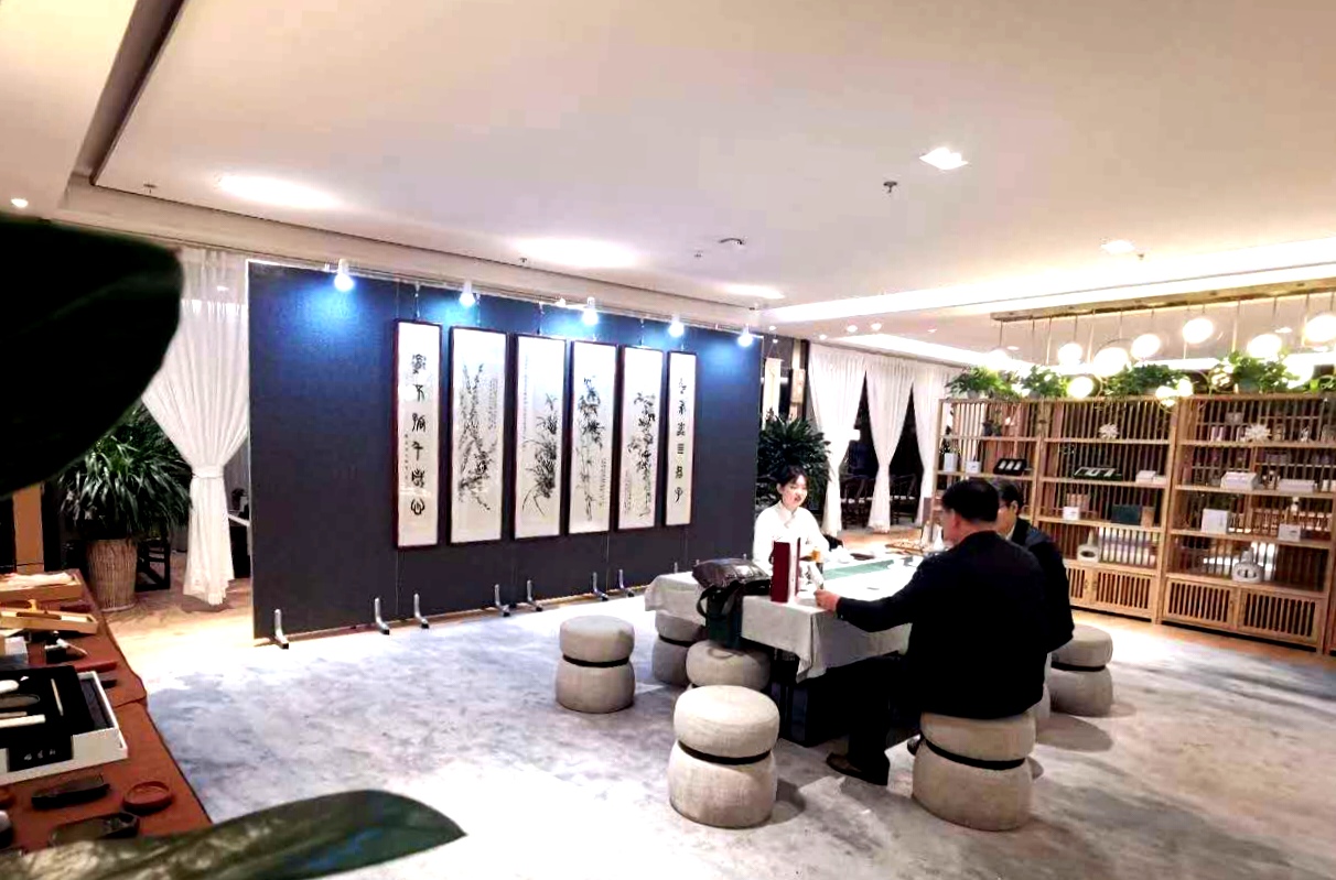 繞過(guò)木架綠植,穿行于鋪陳有字貼宣紙的書(shū)案,現(xiàn)場(chǎng)彈奏的琵琶古韻從耳畔飄過(guò),茶香伴著墨香沁人心脾。你可以駐足細(xì)品這些書(shū)畫(huà)的精微高超之處,你可以圍桌而坐品茗閑談,興起時(shí)你還可以搖管潑墨揮灑一番……