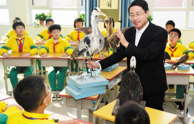 11月是河北省保護野生動物宣傳月,滄州市野生動物救護中心的專家走進中小學校,向學生們宣講愛鳥護鳥知識,引導孩子們從小樹立尊重自然的生態(tài)文明理念,積極參與野生動物保護活動。圖為11月10日,在滄州市河間英華學校,滄州野生動物救護中心的專家孟德榮教授為學生們講解愛鳥護鳥知識。新華社發(fā) 傅新春 攝