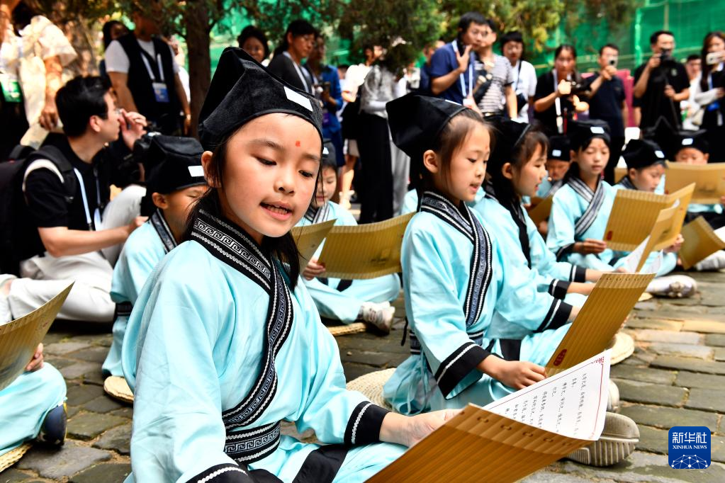 6月27日,在曲阜孔廟,嘉賓和游客在聆聽孩子們誦讀《論語》。