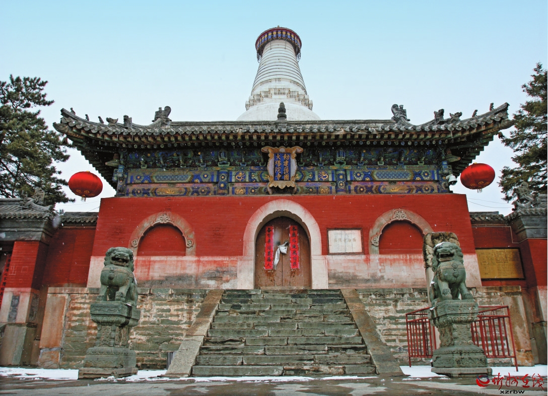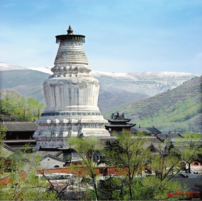大白塔全名釋迦文佛真身舍利寶塔。該塔在元大德五年(公元1302年)由尼泊爾匠師阿尼歌設(shè)計建造,塔身用石頭砌成。地上部分高度為56.37米,比北京北海大白塔高20.4米,故有“清涼第一圣境”的美譽。大白塔之東,一進三院。前院為都綱院,中院為錢糧庫,后院為方丈院。