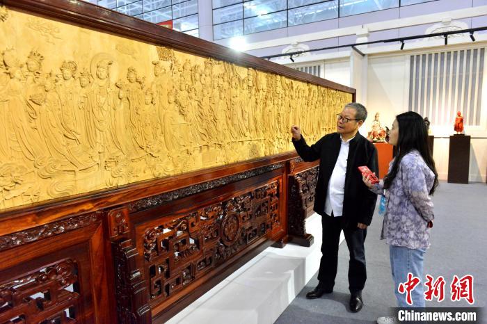 5月9日,第四屆中國工藝美術(shù)博覽會在福建福州啟幕,圖為雕漆作品《凈土文化對瓶》吸引觀展者目光。 中新網(wǎng)記者 呂明 攝