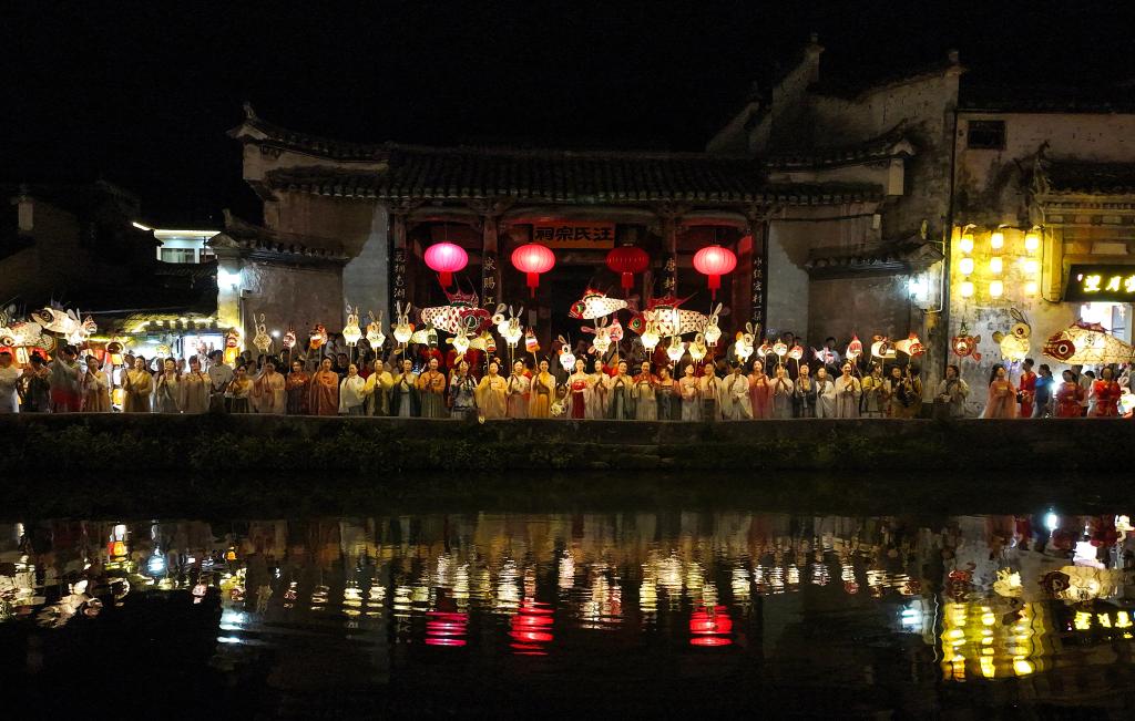 9月15日,花燈表演隊(duì)伍在安徽省黃山市黟縣宏村巡游(無人機(jī)照片)。新華社發(fā)(施亞磊 攝)