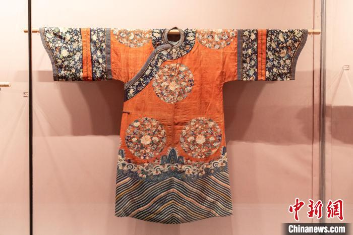 中新網(wǎng)北京10月10日電 題:探訪“五彩錦簇——中華服飾文化展”:民族交融史書藏于華服 中新網(wǎng)記者 孫更亭 服飾,被稱為“穿在身上的史書”。近日,中國(guó)工藝美術(shù)館(中國(guó)非物質(zhì)文化遺產(chǎn)館)“五彩錦簇——中華服飾文化展”展廳內(nèi)的觀眾絡(luò)繹不絕。柯?tīng)柨俗巫謇C花女袍、赫哲族魚皮衣、藏族銀腰飾……展覽匯聚了多個(gè)民族的特色服飾,款式多樣、材質(zhì)紛繁、工藝精湛、色彩絢麗,堪稱一場(chǎng)服飾文化盛宴。 置身廳內(nèi),200余件服飾述說(shuō)著各民族在交往交流交融中不斷發(fā)展的歷史脈絡(luò)與中華服飾文化綿延不斷的生命力。步入“多元一體”民族服飾展廳,一件“滿族緙絲紅地八團(tuán)花卉紋吉服袍”引人注目。 這件吉服袍為清代滿族貴族女性在儀禮場(chǎng)合穿用,其基本形制為圓領(lǐng)、右衽、闊袖,衣身兩開據(jù)。胸背、兩肩及前后下擺處緙織八團(tuán)暗八仙花卉紋,底擺緙織海水江崖紋,整體裝飾紋樣繁復(fù)華麗、寓意吉祥美滿。