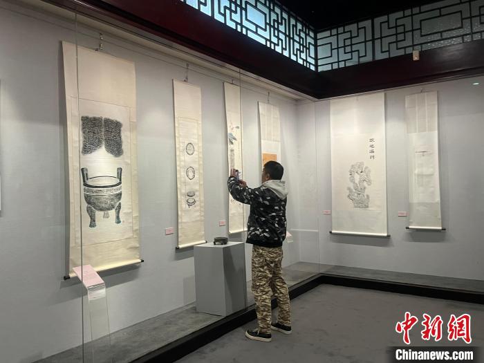 12月24日,湖北省級(jí)非遺項(xiàng)目“金石器物全形傳拓技藝”代表性傳承人張友海(右)帶領(lǐng)友人參觀武漢博物館“墨拓千秋——金石器物全形傳拓技藝保護(hù)成果展”。中新社記者 武一力 攝