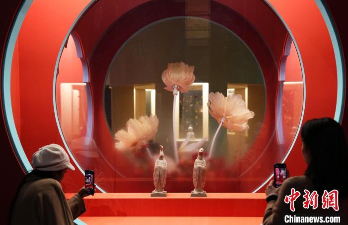 據(jù)介紹,這是蛇類紋飾作為裝飾題材出現(xiàn)在商周青銅禮器之上的一種典型代表。半人半蛇的唐代“伏羲女媧像立幅”帛畫,印證著伏羲女媧這一久遠(yuǎn)的文化信仰,通過(guò)絹帛畫形式在當(dāng)時(shí)的吐魯番地區(qū)傳播,并吸引其他民族的崇奉。此外,展廳中充滿新春氛圍感的桃花洞釉燈籠瓶、白玉“天官賜?!迸濉ⅰ昂镁啤卑子员P等近200余件(套)館藏文物精品,書寫著對(duì)即將到來(lái)的蛇年新春的期待和祝福。