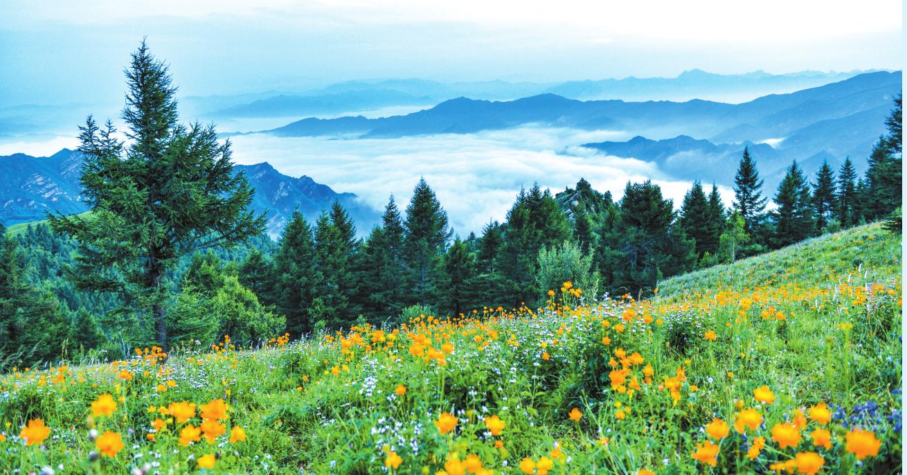 駝梁地形四周封閉,中為谷地,形成了山巒綿亙、溝壑縱橫、河川橫跨東西的自然生態(tài)景觀。其主峰海拔2281米,為“晉冀兩省四縣”交匯處,駝峰山巒蜿蜒,此起彼伏,猶如“靜臥巨駝”而取名駝梁。與五臺山風(fēng)景名勝區(qū)東北相望,遙相呼應(yīng),有其獨(dú)特和不可替代之優(yōu)勢,同為五臺山旅游資源亮點(diǎn)。由山谷到山頂分布著落葉林混交林帶、樺樹林帶、落葉松林帶,生物垂直分布變化明顯。駝梁頂部,有一片亞高山草甸,約近萬畝的茵茵綠草,像碩大無比的地毯,與天際交接,一望無垠。隱于藍(lán)天白云和松林綠波之間,散落著漫山遍野的杜鵑花、金蓮花、百合花、燈籠花等,置身其間,如進(jìn)花海,恍若仙境。因位于云霧縹緲的高山之巔,故被人譽(yù)為“云頂花?!?。
